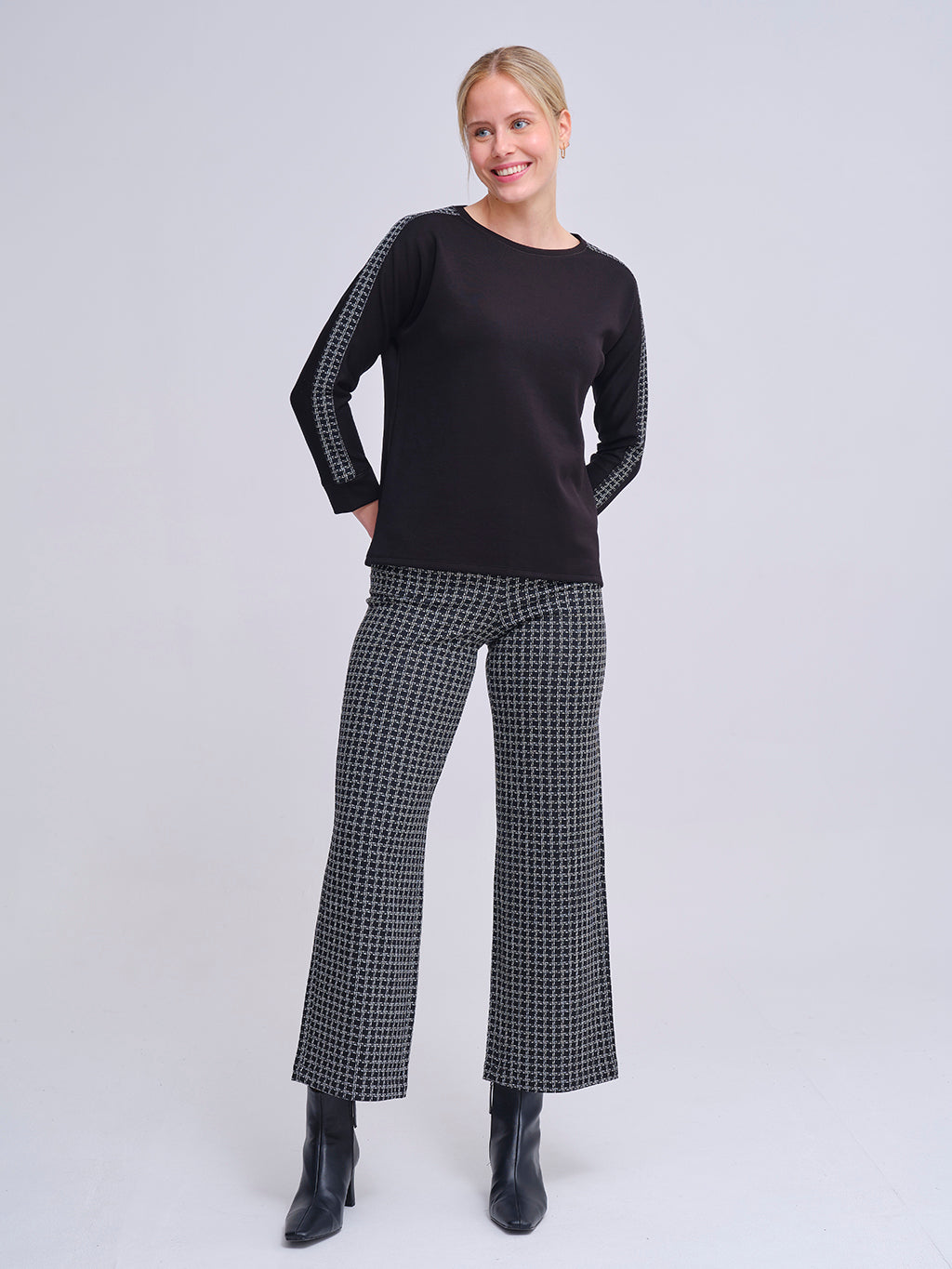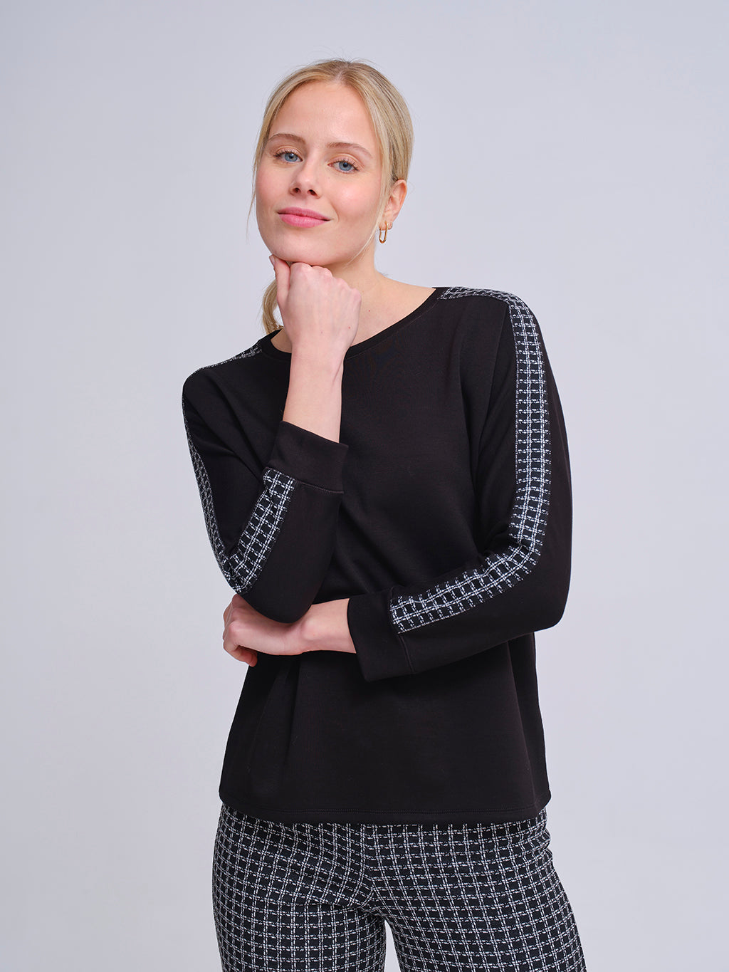 Camiseta de manga larga en color negro con aplicaciones de estampado de cuadros en los brazos, que aportan un aire moderno y sofisticado. Su diseño recto y atemporal permite combinarla con pantalones lisos o conjuntos coordinados, creando looks equilibrados entre lo clásico y lo contemporáneo. Perfecta para un estilo casual-chic en cualquier ocasión.