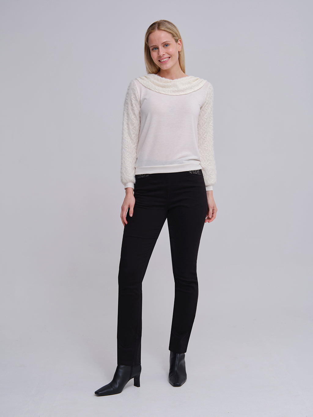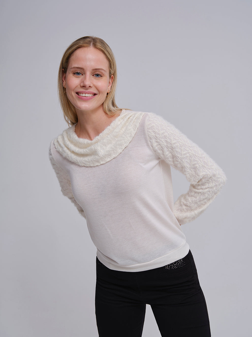 Jersey de manga larga en color blanco con diseño delicado y femenino. Destacan sus mangas y cuello confeccionados en un tejido de textura suave con efecto aterciopelado, que aportan volumen y originalidad al look. El cuerpo liso crea un contraste equilibrado, ideal para un estilo elegante y confortable en los días frescos.