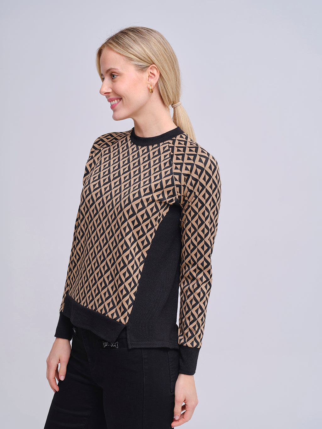 Jersey de manga larga con un llamativo estampado geométrico en tonos negro y beige. Con cuello redondo y detalles lisos en puños, laterales y cintura, combina comodidad con un diseño moderno y sofisticado. Ideal para elevar looks casuales o de oficina con un toque actual.