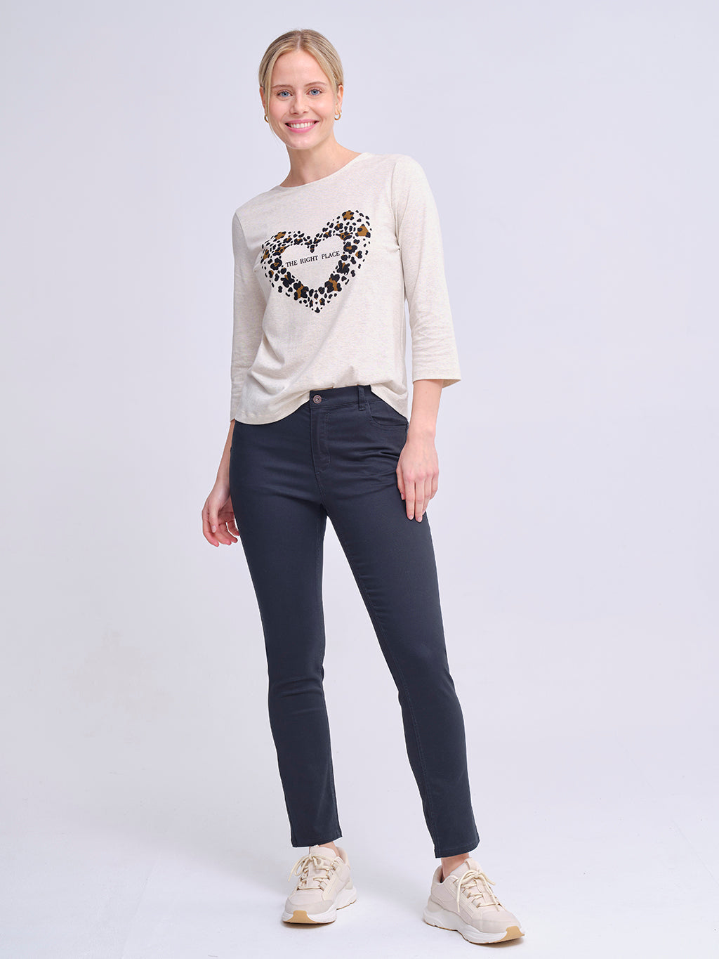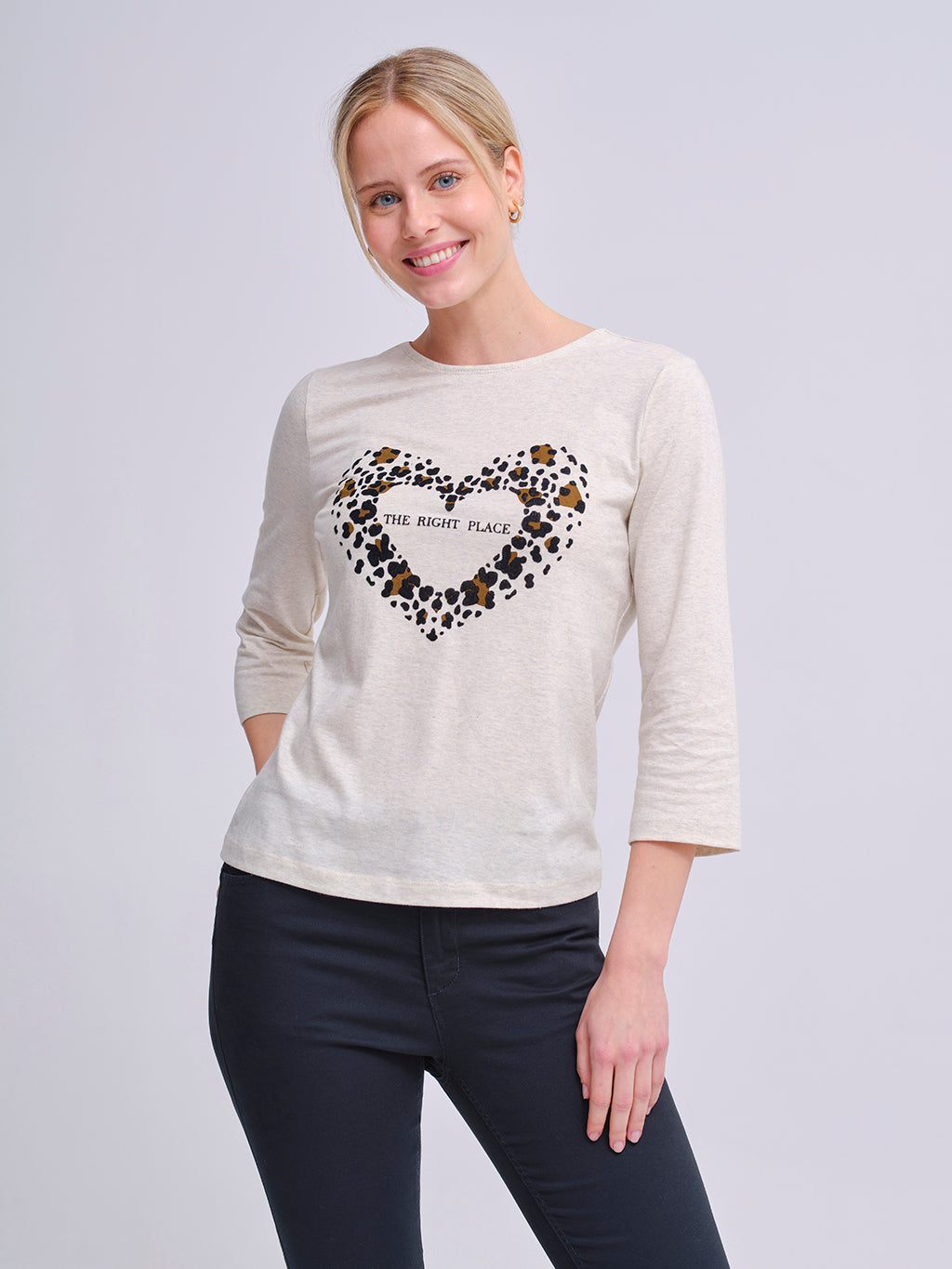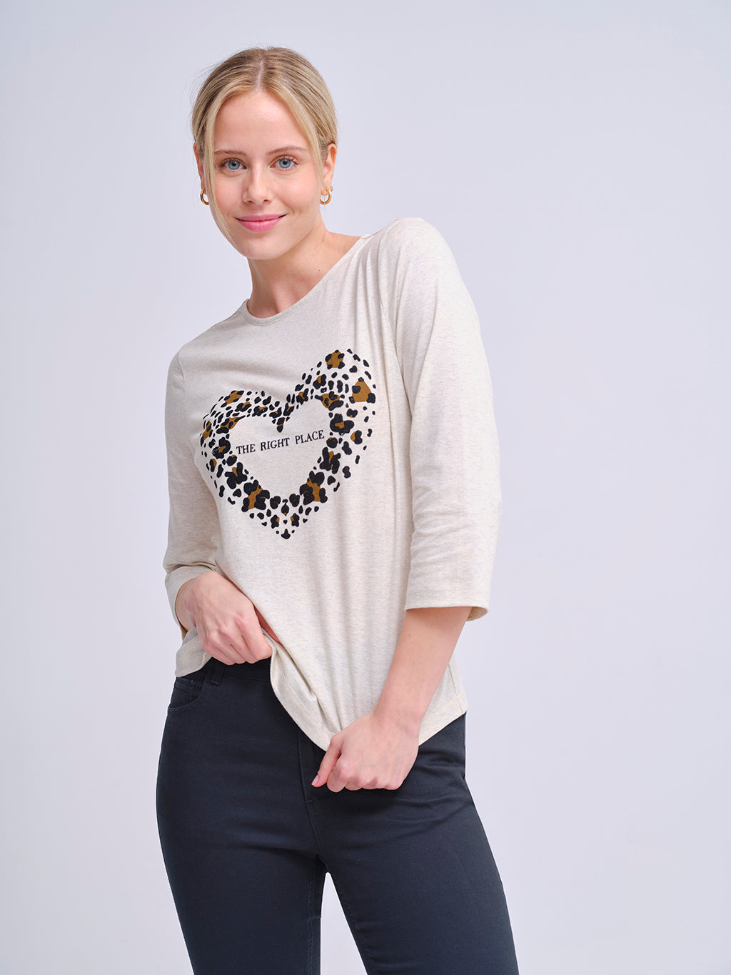 Camiseta de manga francesa en color beige con un llamativo corazón estampado en animal print que enmarca el mensaje “The Right Place”. Una prenda original que combina el toque moderno del print con un diseño cómodo y versátil, ideal para darle personalidad a tus looks diarios. Su tejido suave la convierte en una pieza práctica y con estilo para cualquier ocasión casual.