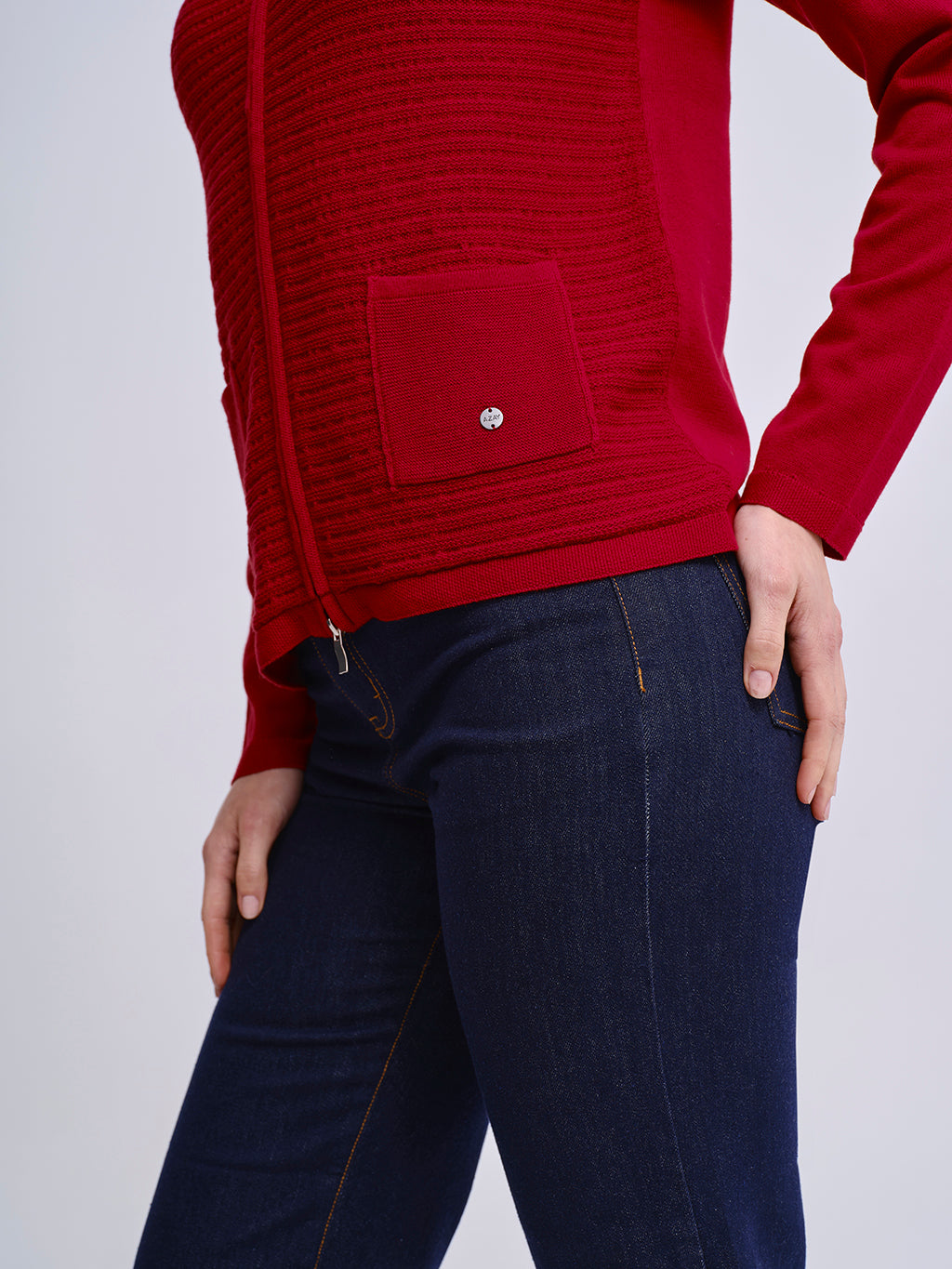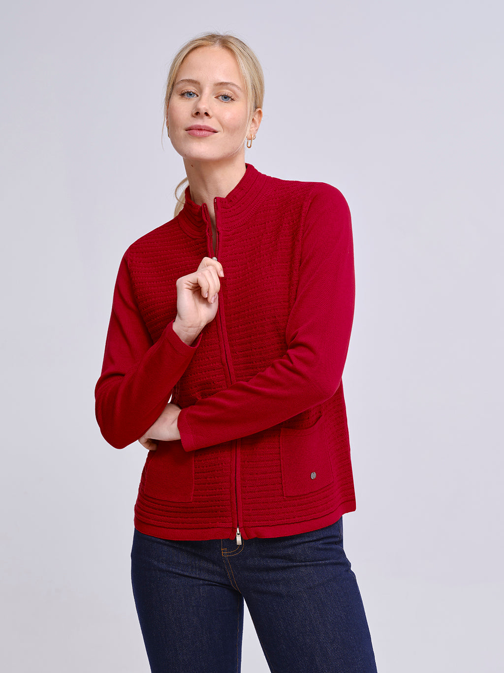 Chaqueta de punto en un vibrante color rojo, con cierre de cremallera y bolsillos frontales funcionales. El diseño combina un tejido liso con detalles acanalados en la parte delantera y el cuello, lo que aporta textura y estilo. Una prenda cómoda, elegante y práctica para el día a día.