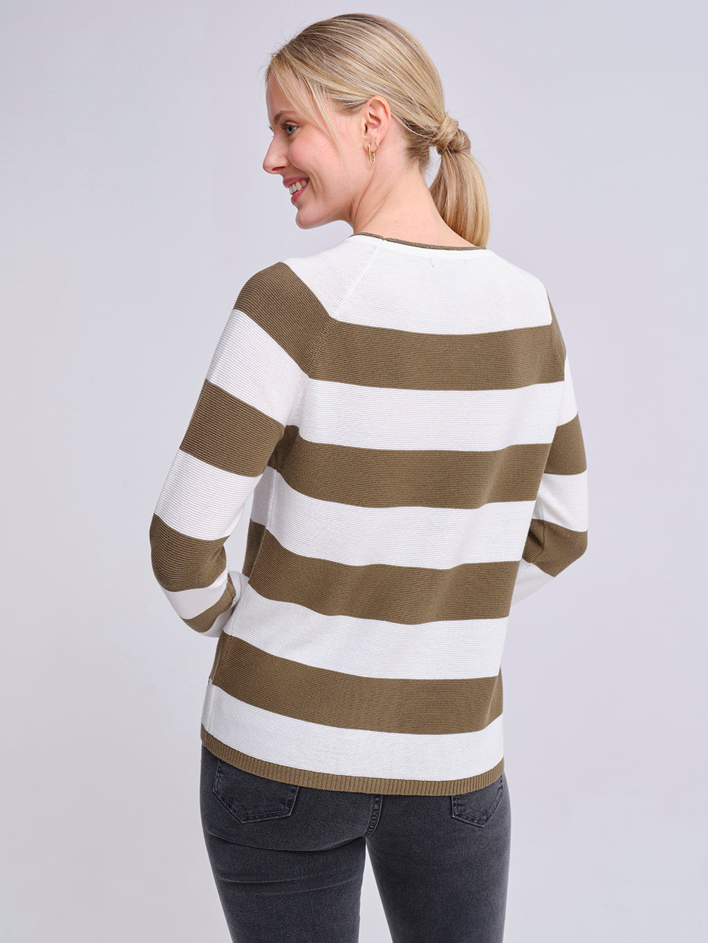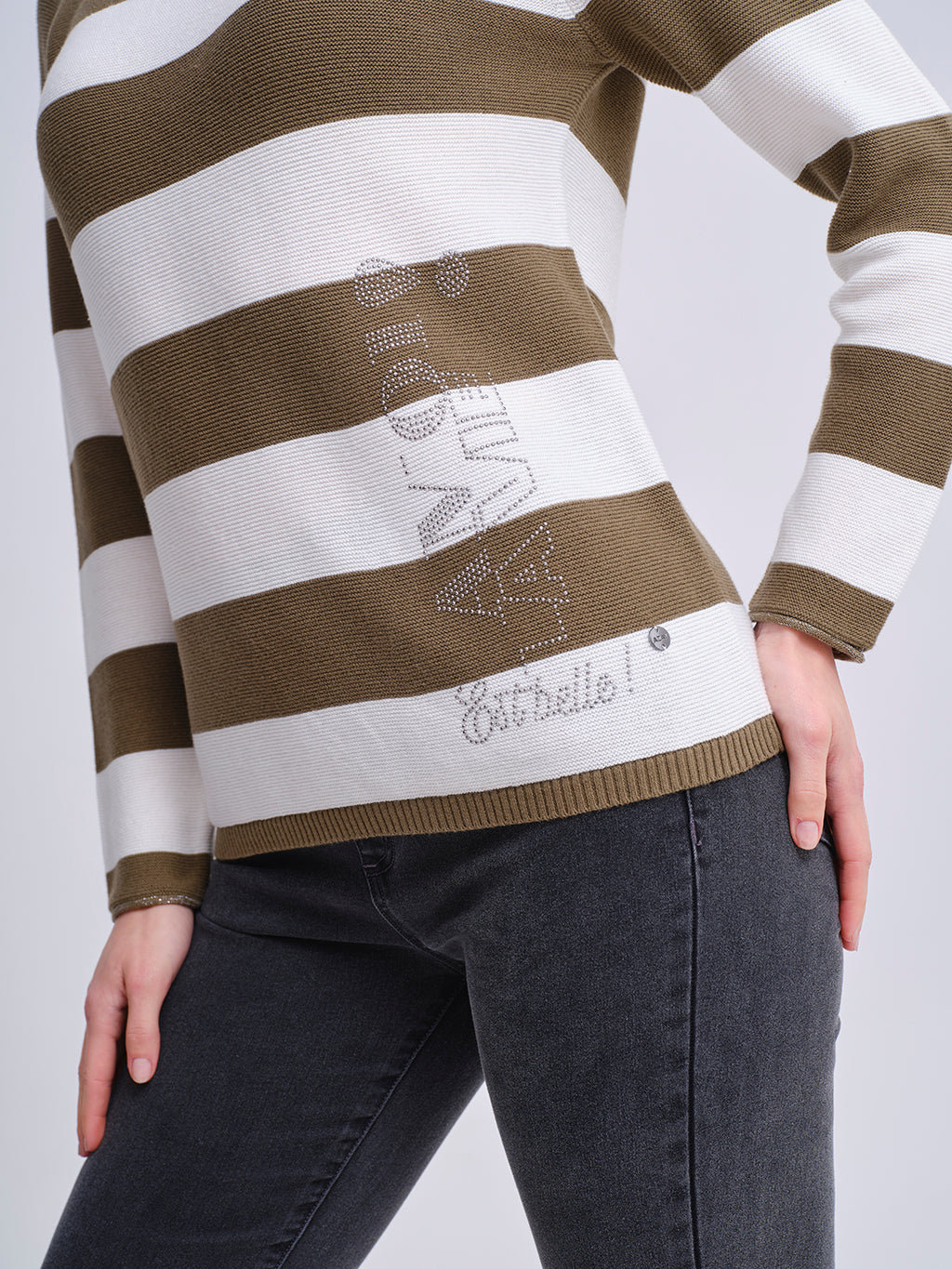 Jersey de punto a rayas anchas en tonos verde oliva y blanco, con cuello redondo y detalle brillante en la parte inferior que aporta un toque moderno y distintivo. Una prenda cómoda y versátil, ideal para looks casuales con estilo.