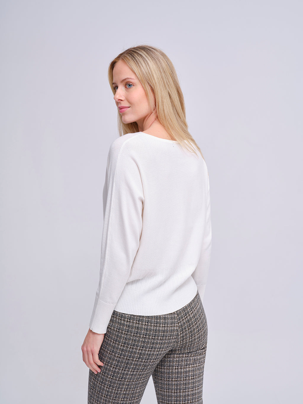 Jersey liso en color blanco, de manga larga y cuello redondo, confeccionado en tejido suave y ligero. El diseño incluye detalle de canalé en el bajo que aporta un ajuste favorecedor. Una prenda esencial, versátil y fácil de combinar, ideal como fondo de armario para looks elegantes o casuales.