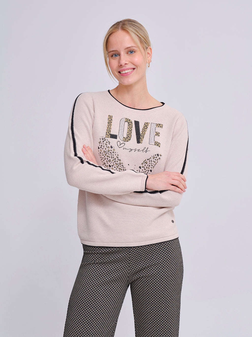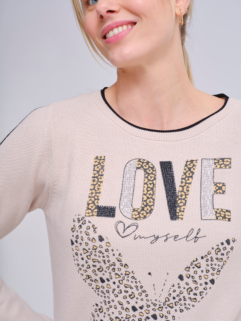 Jersey en tono beige de manga larga con cuello redondo, decorado con un gran motivo de mariposa en animal print y la palabra LOVE en acabado brillante. Incluye detalles en contraste en el borde del cuello y franjas laterales en las mangas que estilizan la silueta. Una prenda femenina, actual y juvenil, ideal para dar un toque de estilo a tus looks casuales.