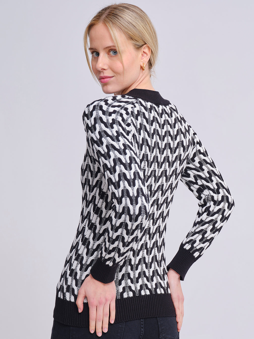 Jersey moderno y versátil confeccionado en punto fino. Presenta un original estampado geométrico en blanco y negro con efecto ondulado, que aporta dinamismo al look. Con cuello redondo, manga larga y acabados en rib en puños y bajo para un ajuste cómodo. Una prenda perfecta para combinar tanto con vaqueros como con pantalones de vestir y crear estilismos actuales.