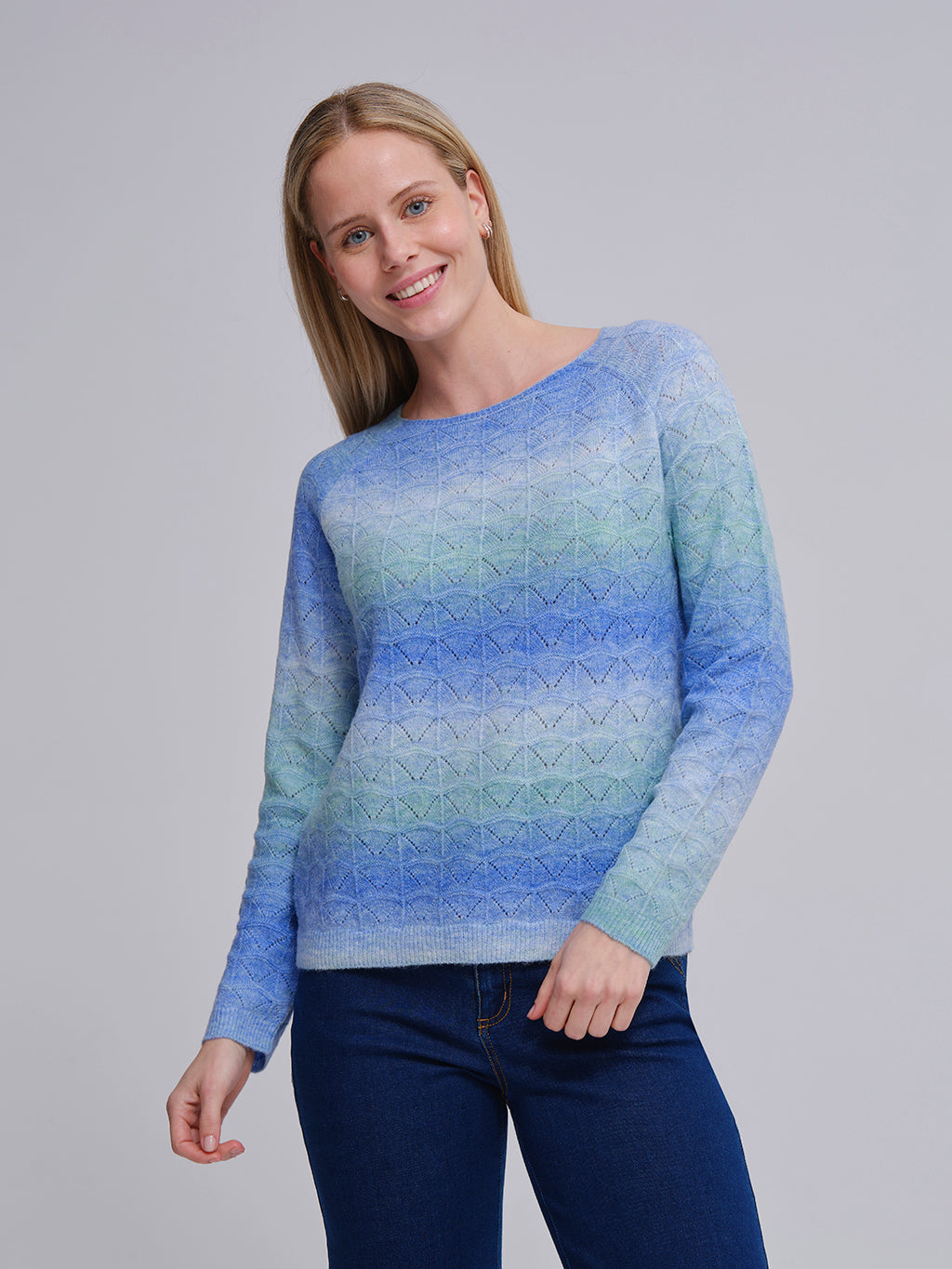 Jersey de punto suave con un delicado efecto degradado en tonos azules y verdes que transmite frescura y modernidad. El diseño incorpora un ligero calado geométrico que aporta textura y un acabado especial a la prenda. Con cuello redondo y manga larga, es perfecto para looks casuales con un toque sofisticado. Una pieza versátil que se adapta tanto a vaqueros como a pantalones más elegantes.