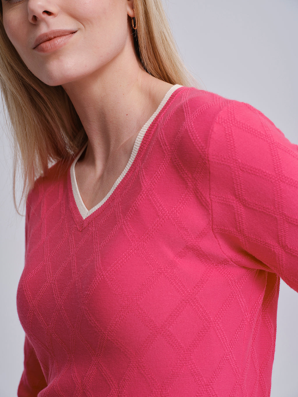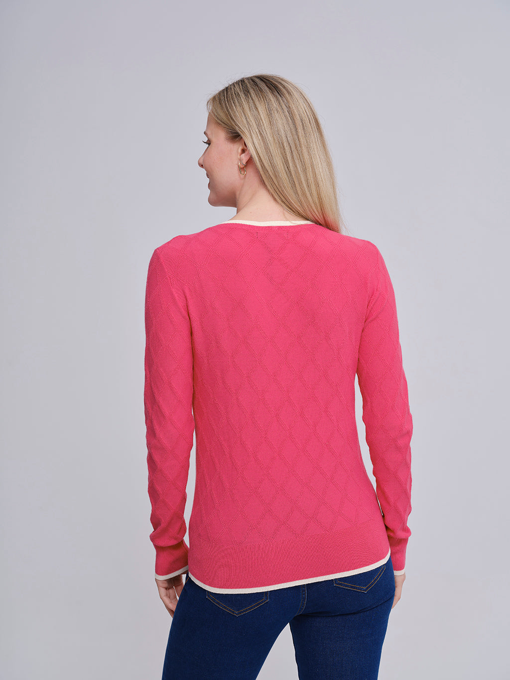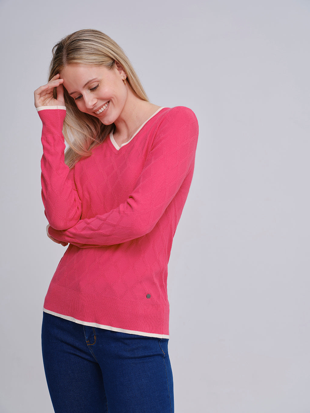 Jersey de manga larga en punto ligero con diseño de rombos en relieve. Presenta un favorecedor escote en V y delicados remates en contraste blanco en el cuello y bajo. Una prenda versátil que combina feminidad y frescura, ideal para darle color a tu armario de diario.