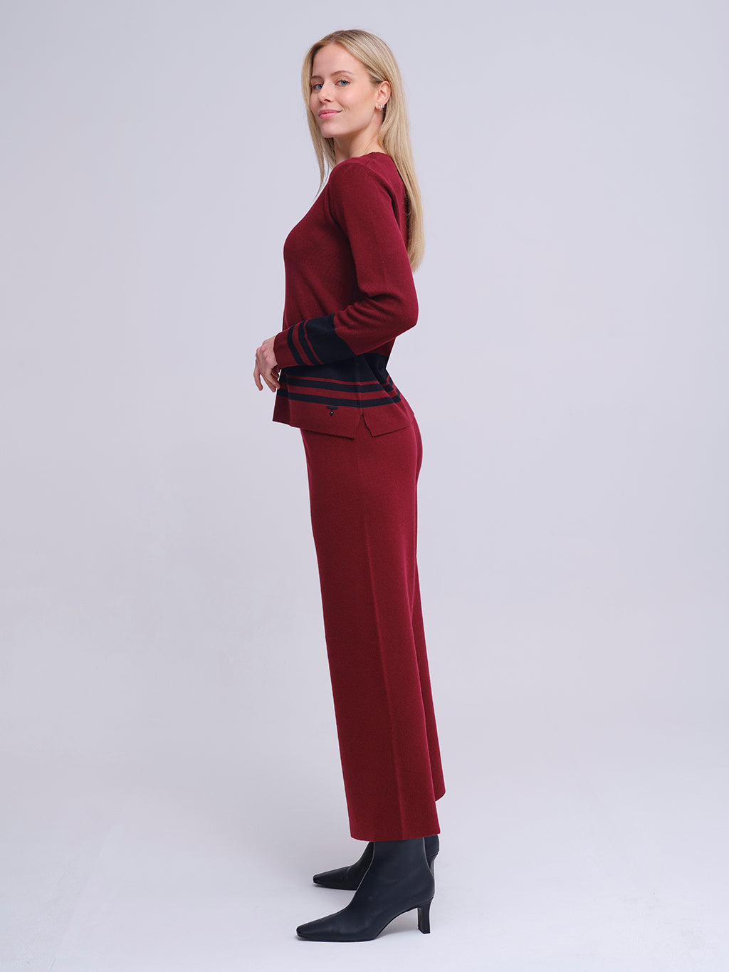 Pantalón de punto en color burdeos, con corte ancho y recto que aporta comodidad y estilo. Su tejido suave y el diseño atemporal lo convierten en una prenda versátil, ideal tanto para un look relajado como para combinar con el jersey a juego y conseguir un conjunto elegante y moderno.