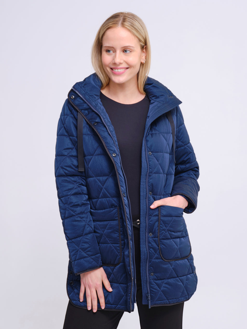 Chaqueta de mujer acolchada en color azul marino con diseño de rombos. Cuenta con capucha ajustable, cierre frontal de cremallera y botones, además de bolsillos grandes con ribete en contraste que aportan un estilo urbano y funcional. Su corte medio la convierte en una prenda versátil y cómoda, ideal para abrigarse en los días fríos con un look casual y actual.