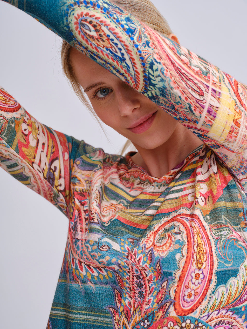 Camiseta de manga larga con un estampado paisley multicolor que mezcla tonos vivos y líneas dinámicas, creando un look original y lleno de personalidad. Su tejido suave y el corte recto aportan comodidad y versatilidad, perfecta para combinar con pantalones lisos o vaqueros y darle vida a tus outfits diarios. Una prenda ideal para quienes disfrutan de un estilo alegre y diferente.