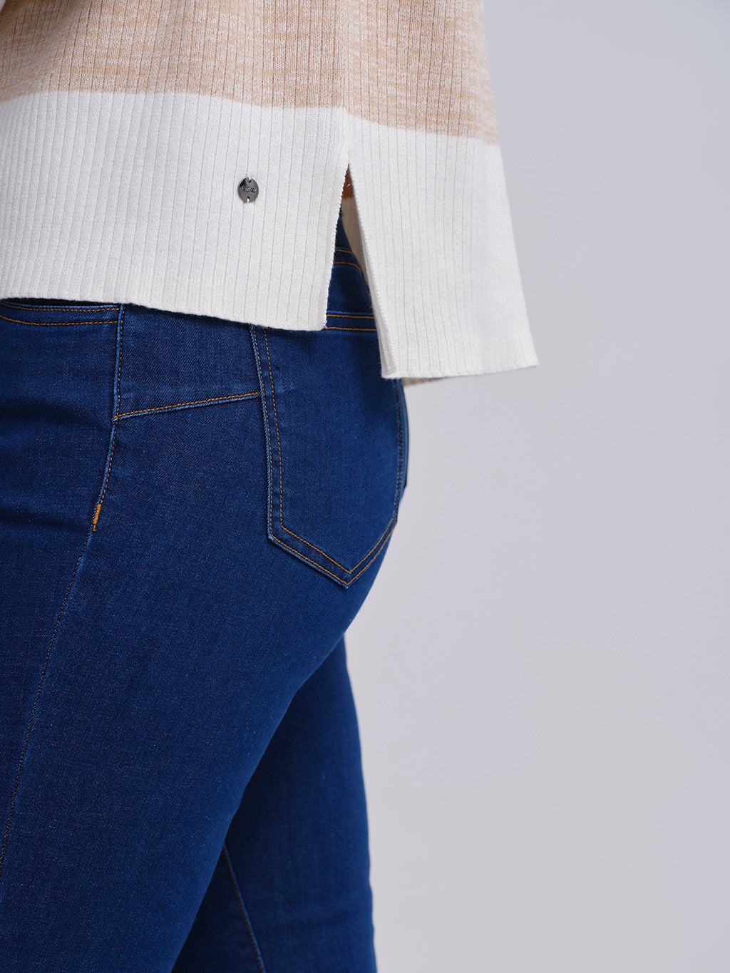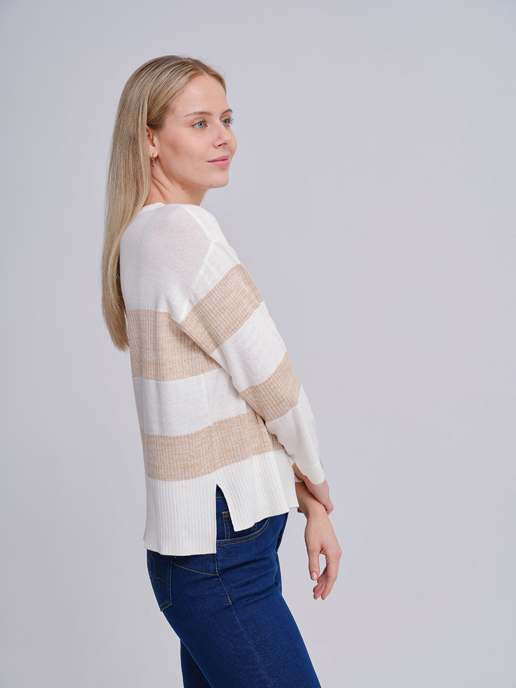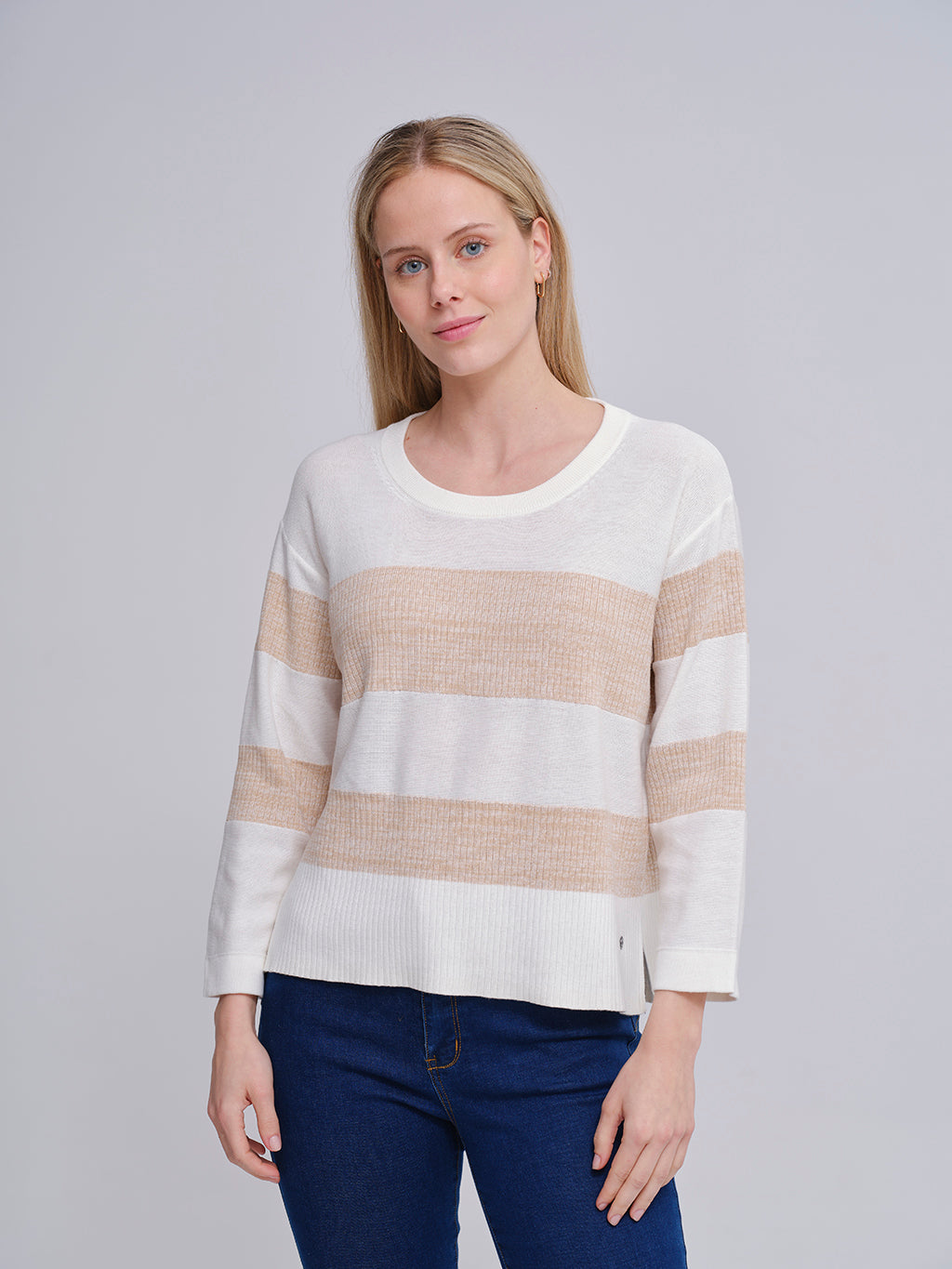 Jersey ligero y cómodo en punto fino, con diseño de amplias rayas horizontales en beige y blanco. Presenta cuello redondo, manga 3/4 y corte recto que favorece la caída natural de la prenda. Una pieza versátil y atemporal que combina fácilmente con jeans o pantalones de vestir, ideal para looks casuales con un aire fresco y elegante.