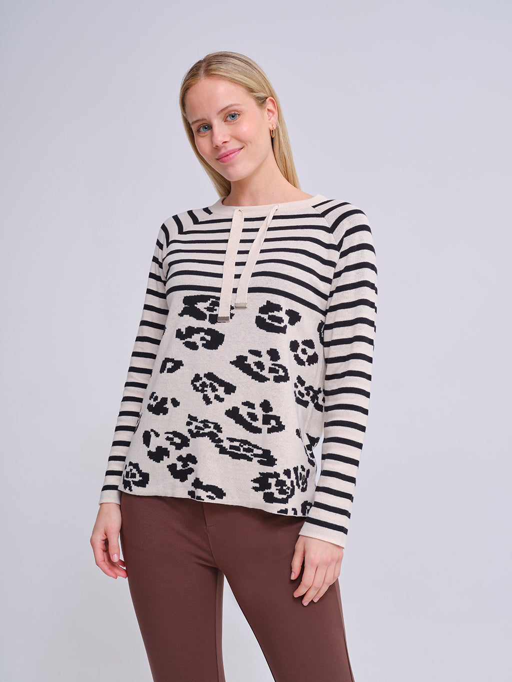 Jersey de punto suave en color beige con diseño a rayas negras en la parte superior y mangas. En la parte frontal combina un moderno estampado animal en contraste que aporta un aire actual y distintivo. Cuello redondo con cordones decorativos y manga larga. Una prenda versátil que une el estilo clásico de las rayas con un toque atrevido, ideal para looks casuales y modernos.