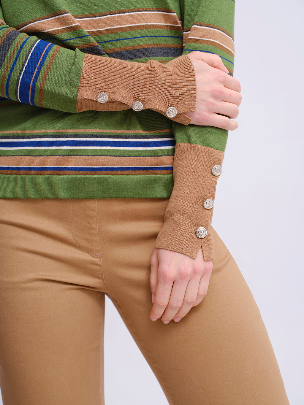 Jersey de punto fino con un diseño de rayas horizontales en una combinación de verdes, azules y tonos tierra que aportan frescura y estilo. Presenta cuello redondo clásico y manga larga con detalle de puños en contraste rematados con botones decorativos metálicos, que añaden un toque original y elegante. Ideal para looks diarios con un aire moderno y versátil.