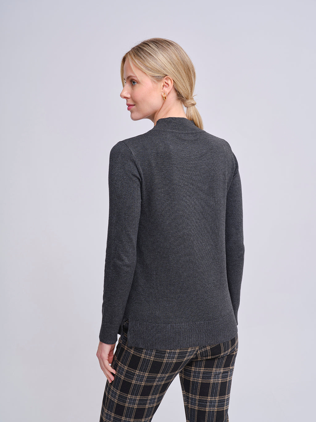 Jersey de manga larga en tono gris oscuro, confeccionado en punto fino y suave. Presenta cuello semi-alto y un delicado motivo geométrico en relieve a lo largo del centro, que aporta sutileza y elegancia. Una prenda versátil que combina comodidad y estilo minimalista, ideal para looks de oficina, reuniones o conjuntos casuales con un aire sofisticado.