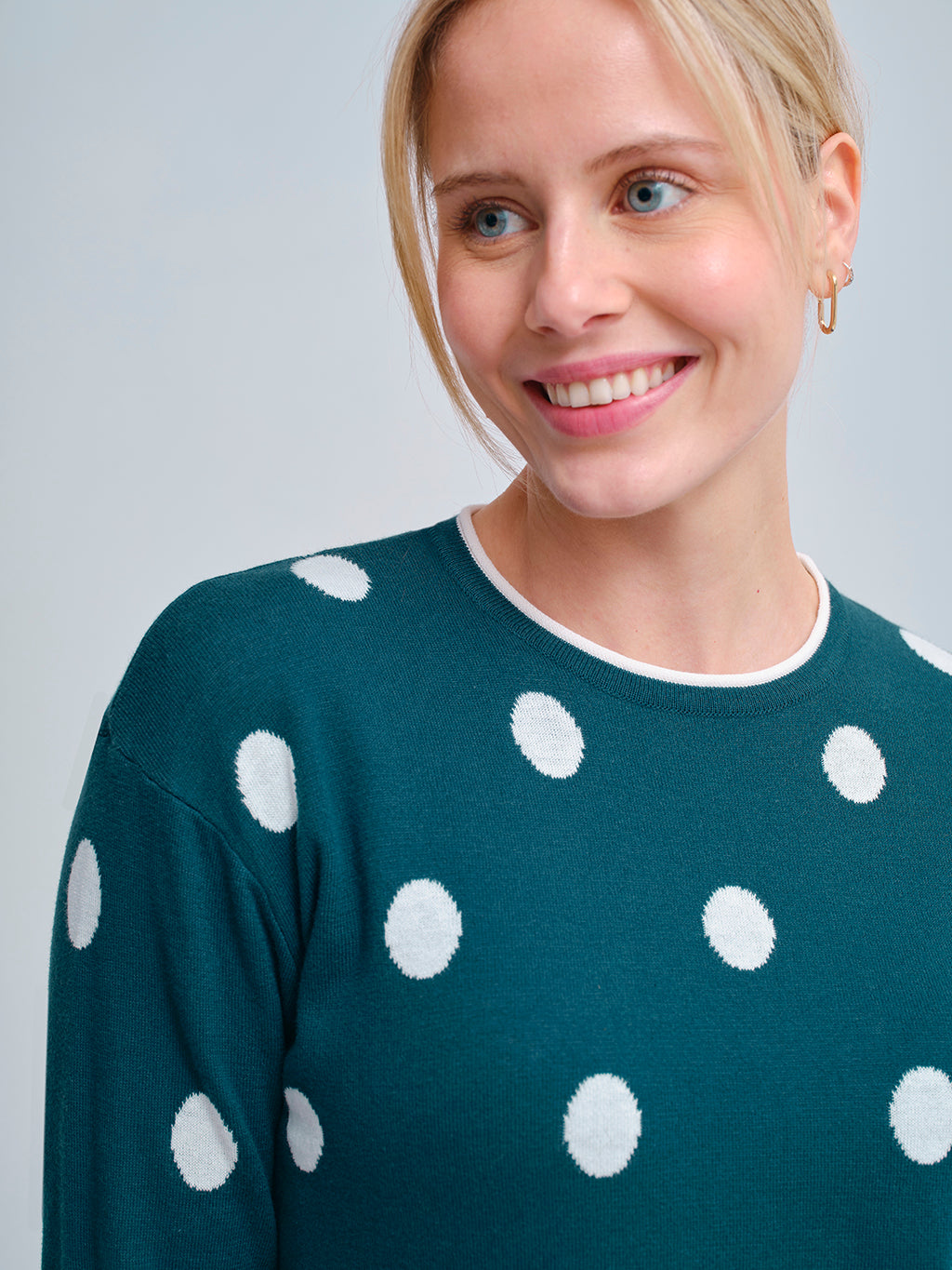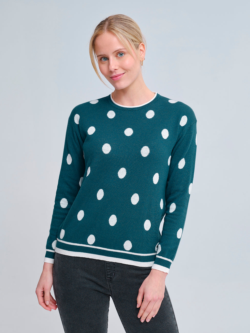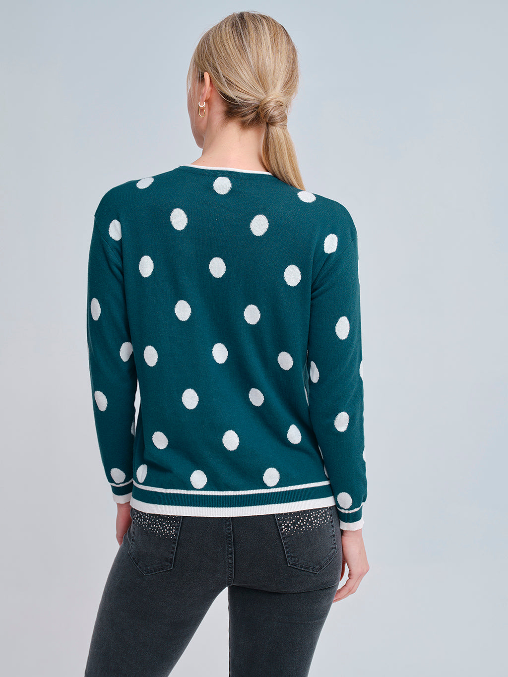 Jersey de manga larga en verde intenso, confeccionado en punto suave y cómodo. Presenta un alegre diseño de lunares blancos en contraste y detalles de ribete en cuello, puños y bajo en blanco con doble línea decorativa. Una prenda versátil y actual que aporta frescura y dinamismo a cualquier look, ideal para el día a día con un toque desenfadado.