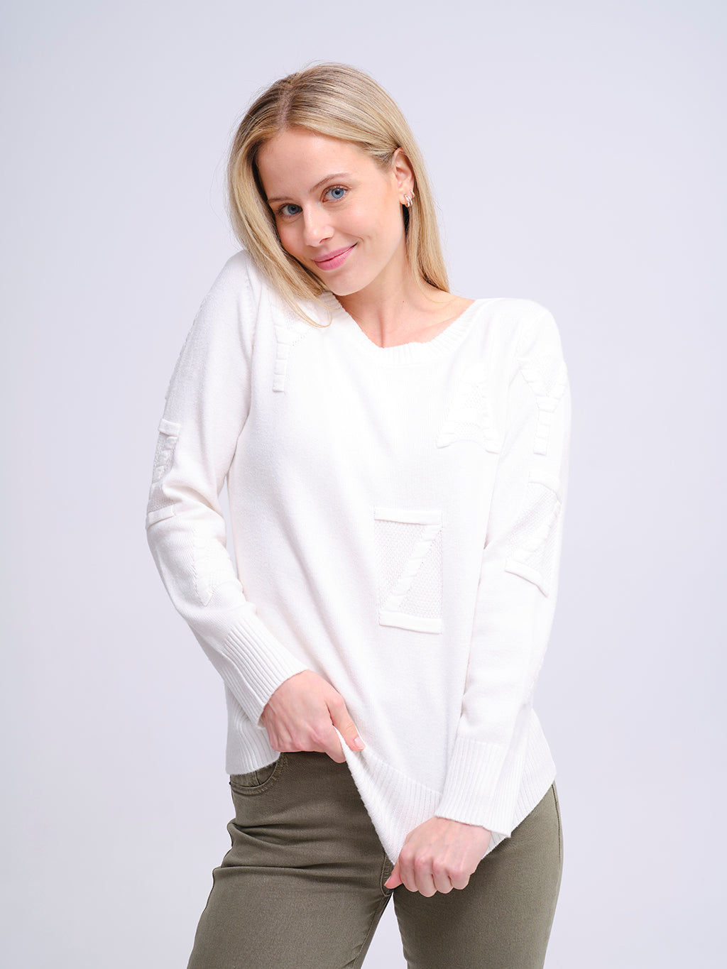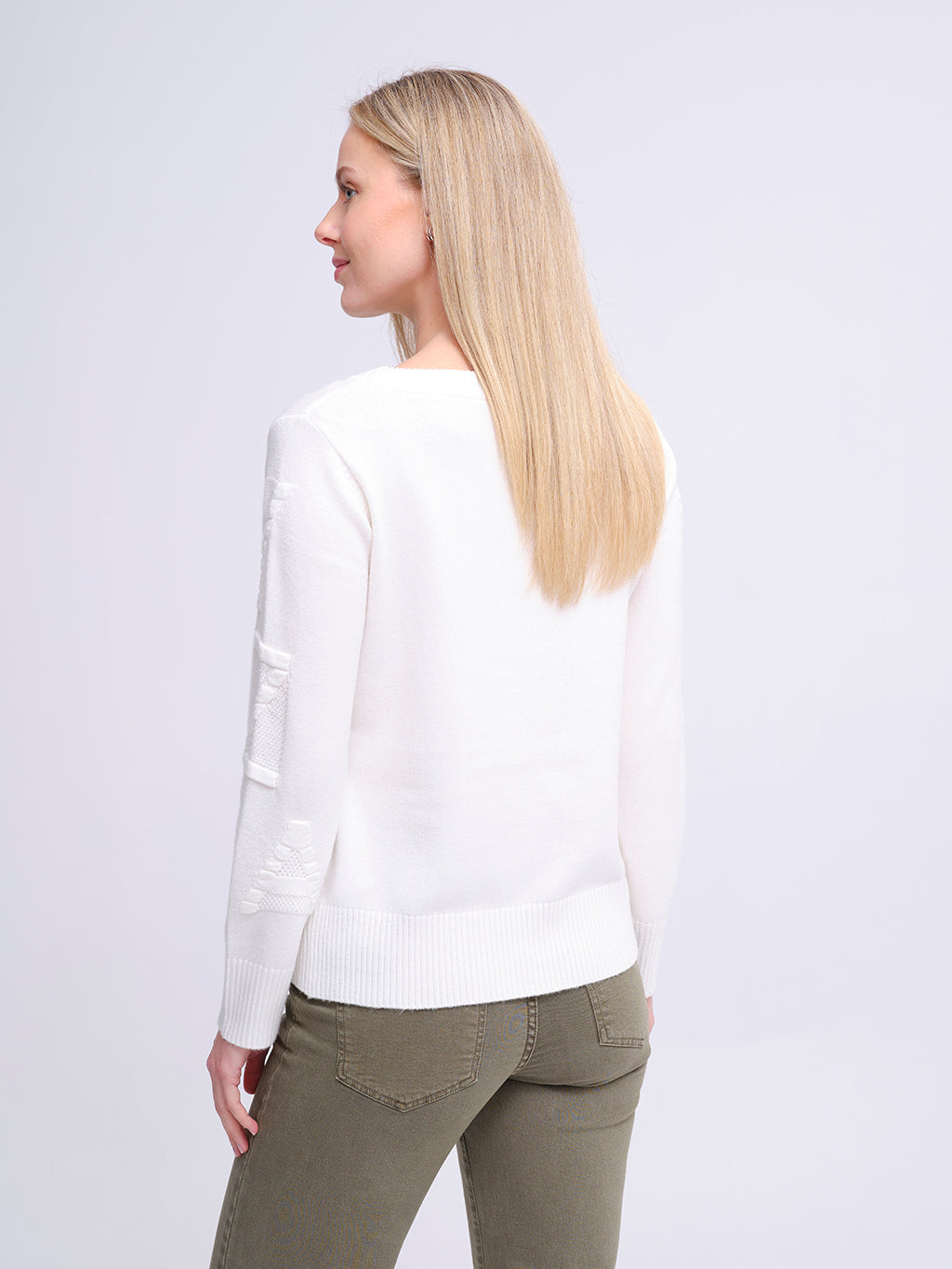 Jersey de manga larga en color blanco con detalles en relieve tono sobre tono que forman letras decorativas en la parte frontal y en las mangas. De corte recto y cuello redondo, combina comodidad y estilo minimalista, ideal para looks casuales elegantes y fáciles de combinar.
